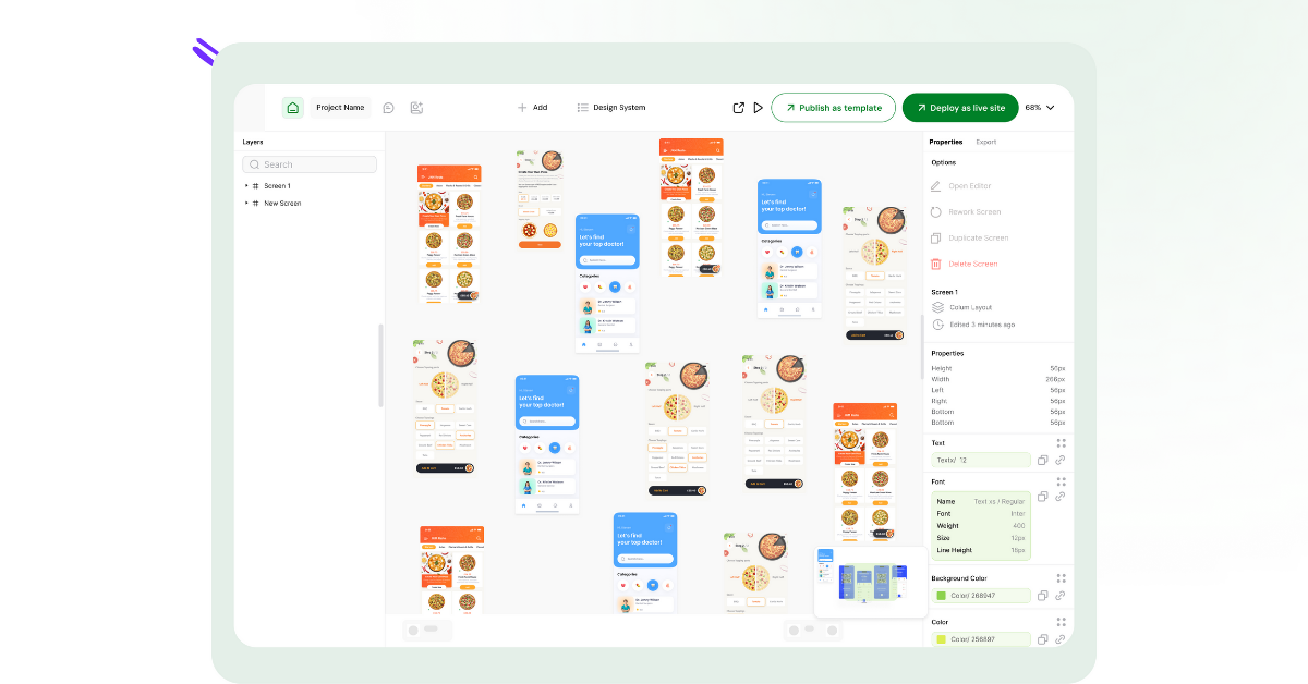 - Code editor: Ability to edit code for each app screen and make tweaks to UI using HTML, Koltin or Swift code